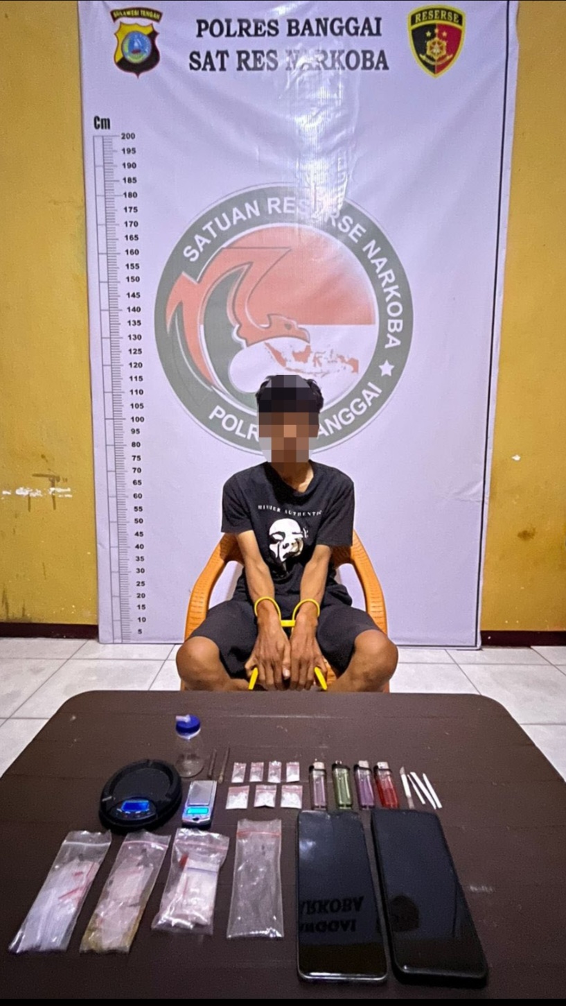 Ket: Pemilik sabu 3,50 gram bersama barang bukti saat diamankan di Mapolres Banggai. (Foto: Humas Polres Banggai)